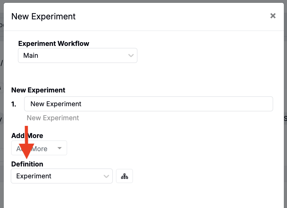 When creating a new experiment, users can select an experiment definition, which sets the structure and purpose of the experiment. In Uncountable, experiments are platform entities, and definitions act as tailored variations of that entity for specific use cases.