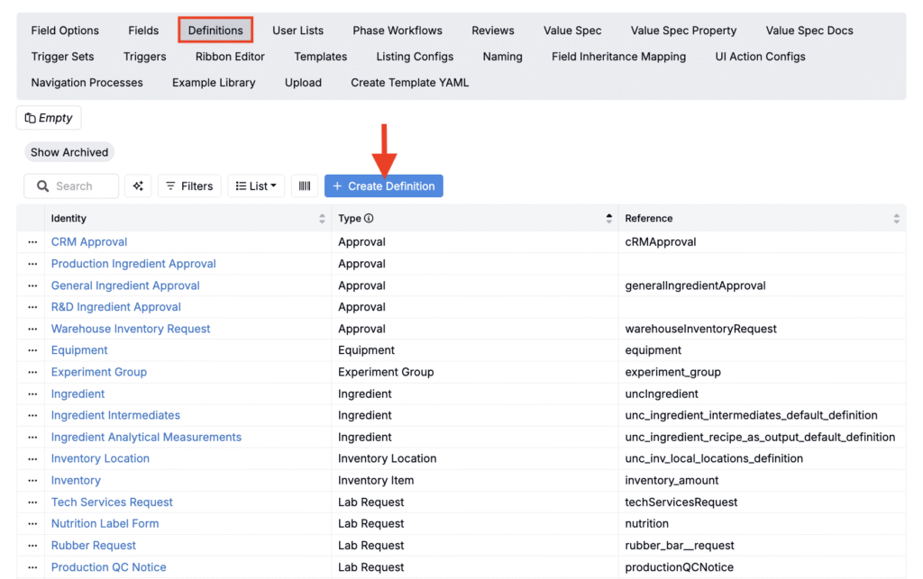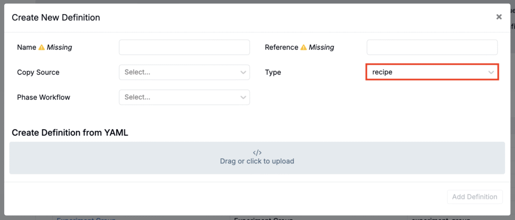 New experiment definitions are created and managed by admins in the Definitions tab of the Form Admin page. When creating a new experiment definition, set the type to “recipe”.