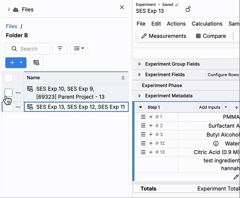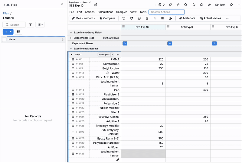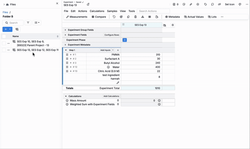This approach can be especially valuable for teams accustomed to ELN-style experiment management. Using the Files sidepanel, you can can create links to specific experiment sets and place them directly into folders. These links appear in the sidepanel, allowing you to open experiments instantly without navigating project by project.