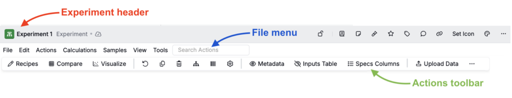 The experiment header appears at the top of the Measurements view and displays key experiment name and definition. You can use the header to lock, unlock, favorite, comment, add notes, view linked entities, and more.