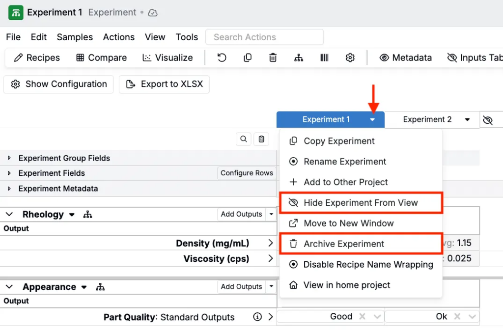 - To remove an experiment from view, click the experiment column header and select Hide Experiment from View.