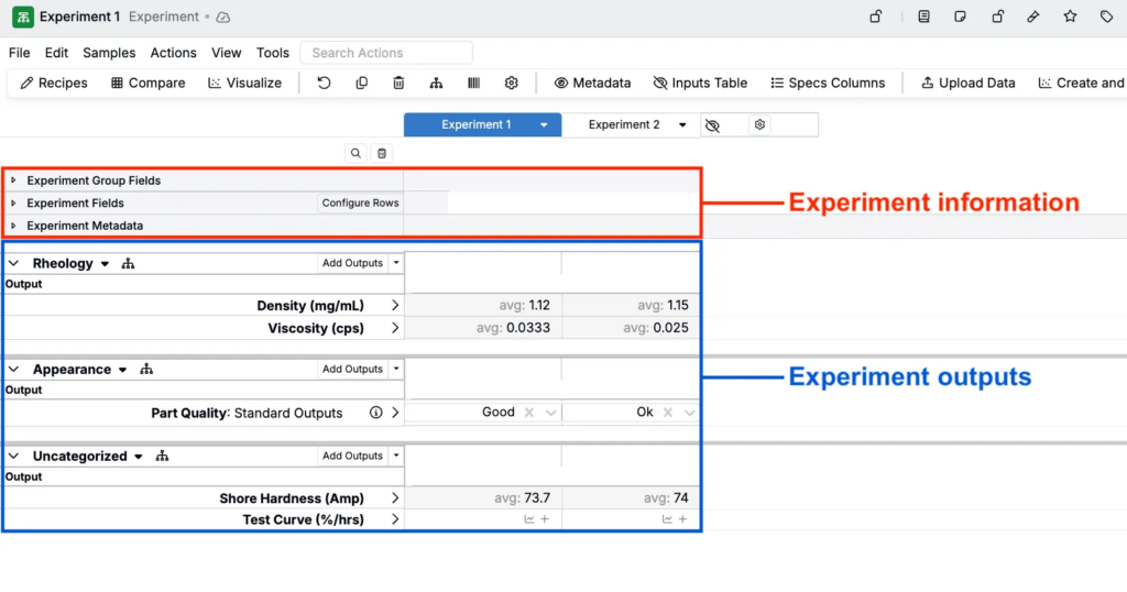 - Measurements Table — The main data entry table for experiment outputs, which can include: