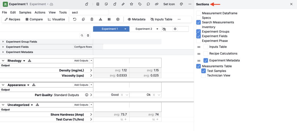 To add or remove sections from the experiment’s measurements view, use the Sections Sidepanel (View > Sections > Sections Sidepanel). Within the sidepanel, use the checkboxes to show or hide sections.