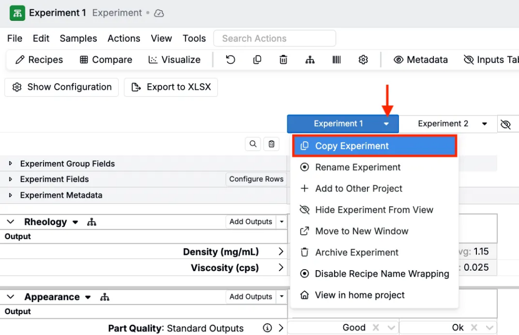 - Copy Experiment — Duplicates the experiment with options to include values, lots, and test samples