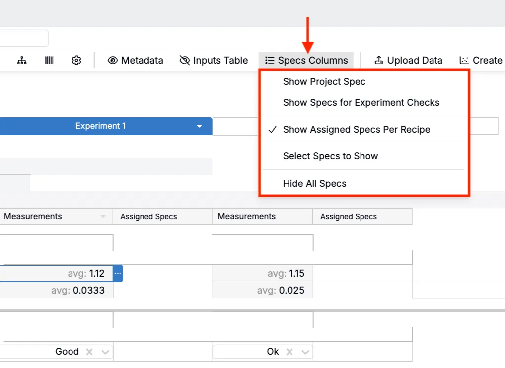 In addition to viewing specs as a row in the experiment information section, you can add project and assigned spec columns to your data table. To do so, click the Specs Columns button in the action bar and select from these options: