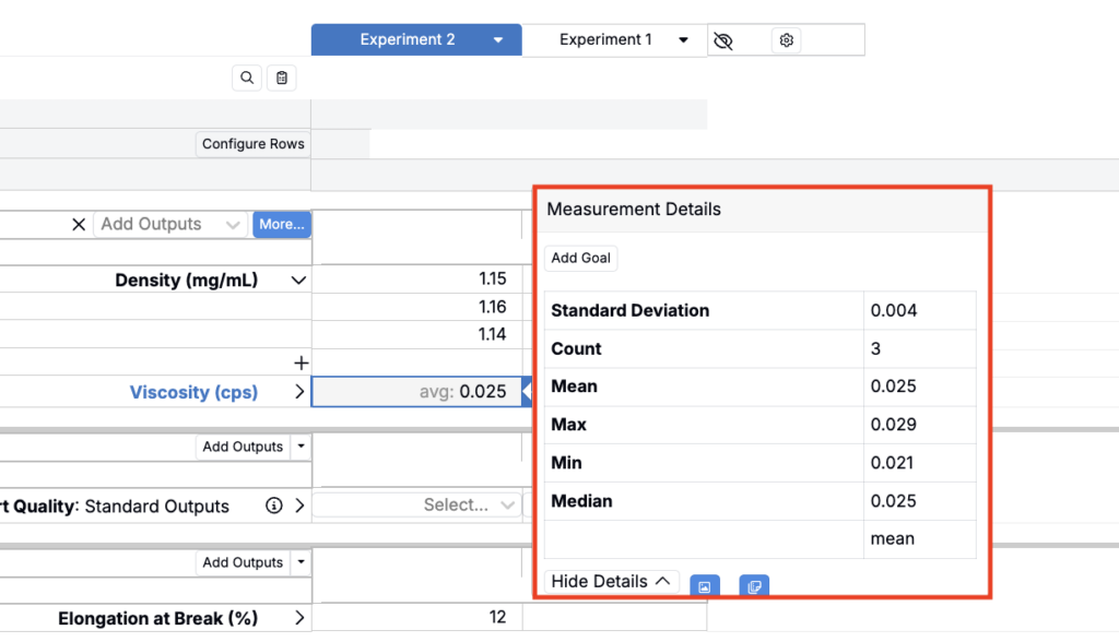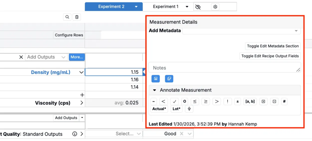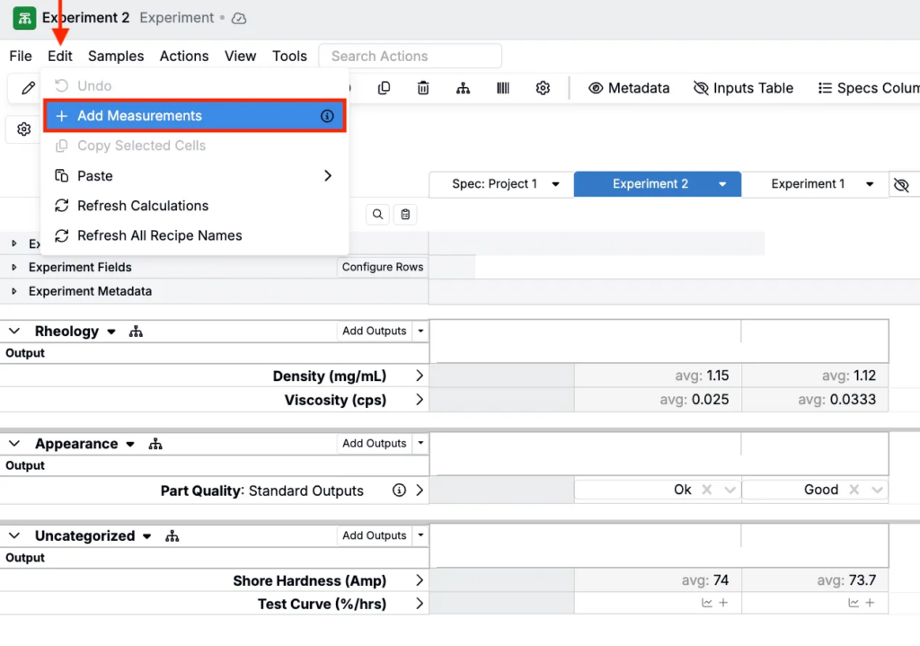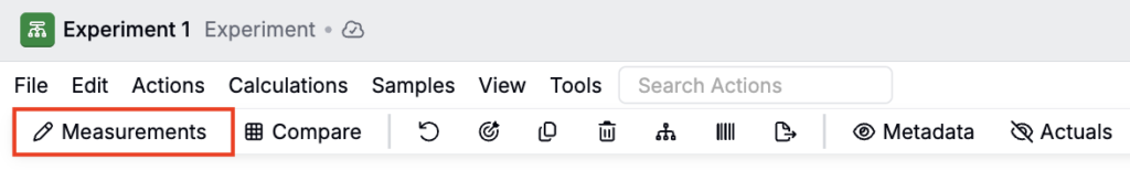 The Measurements view of an experiment (Enter Measurements page) is the primary interface for entering measurement data, including analytical results, performance metrics, and observations. This page works in tandem with the Recipe page, which captures the input data and formulation details for experiments.