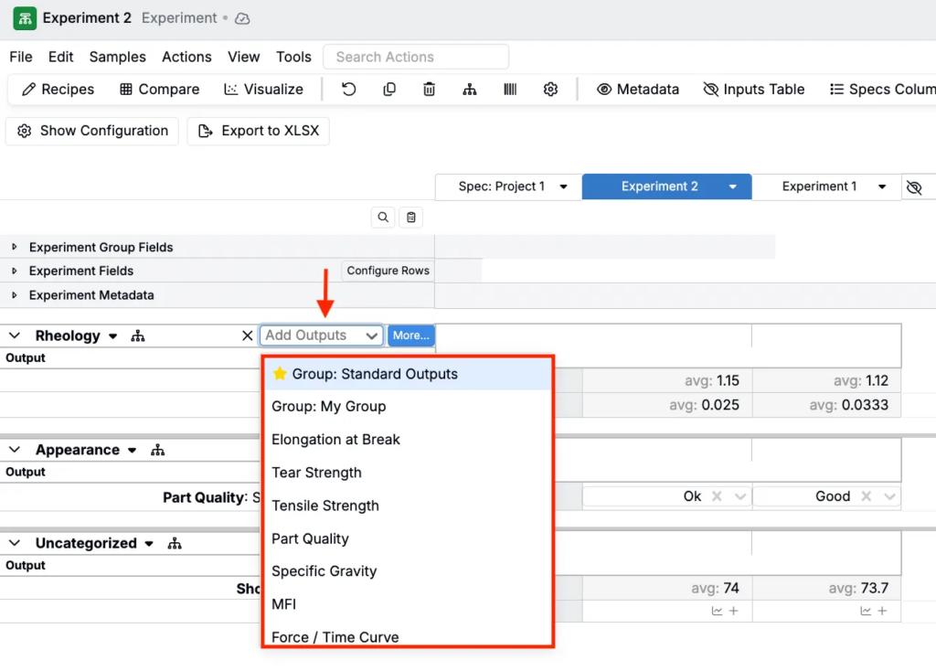 - Outputs are organized by category (e.g. Rheology, Performance, Physicals, Appearance, or Tensile).