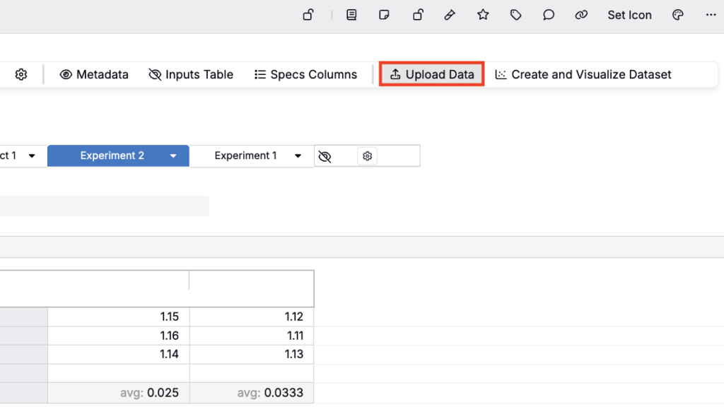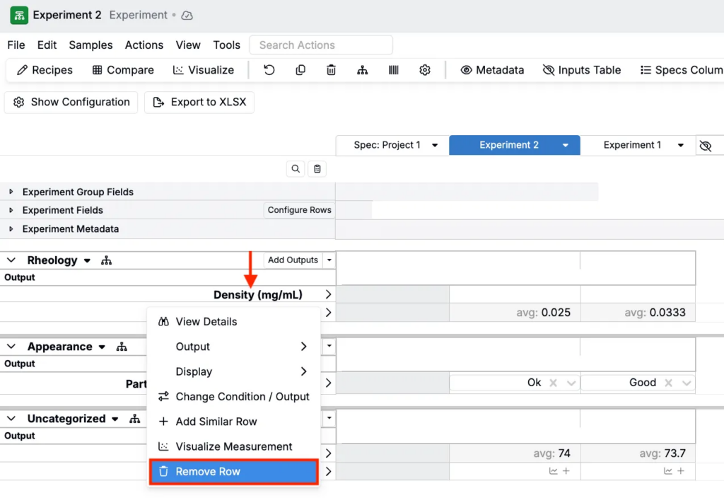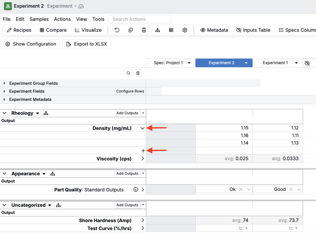 - Show Project Spec — Displays project spec output goals and target ranges as a single column for all experiments in the current project