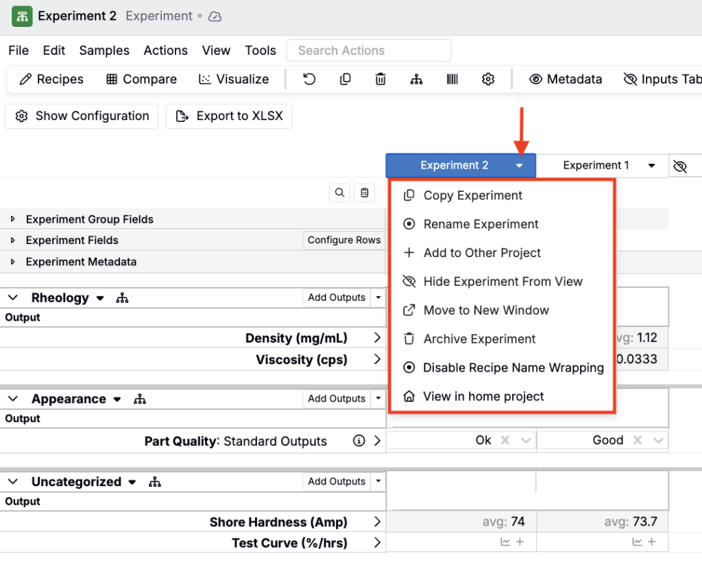 - Copy Experiment Name to Clipboard — Copies the experiment’s name so you can paste it elsewhere