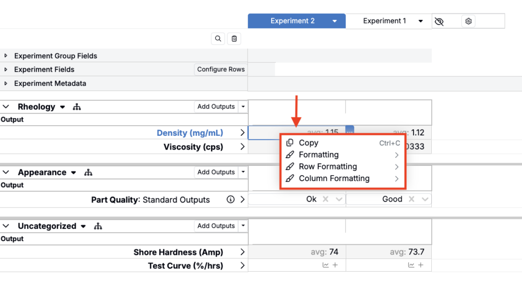 - Column Formatting — Add or remove a highlight color on the entire experiment column