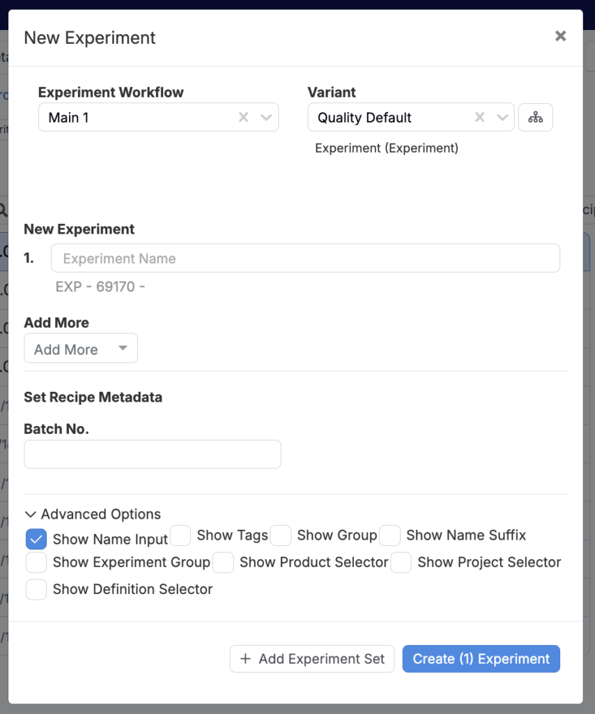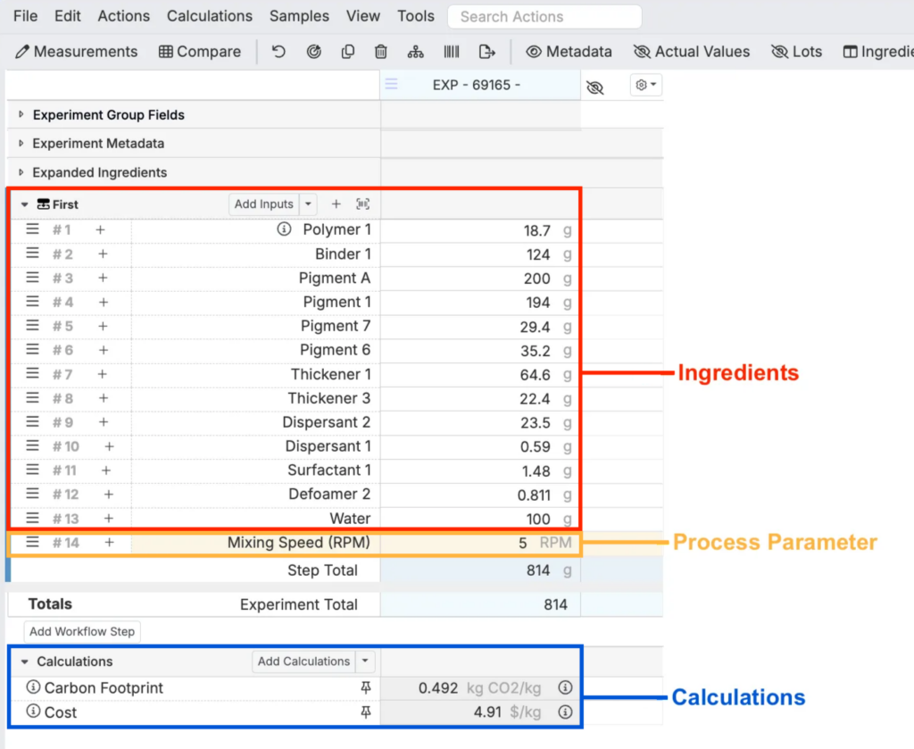 When a clicking into an experiment, users are directed to the Recipe view. This is where you will define the recipe for an experiment before it is run by entering inputs, such as ingredients, process parameters, and calculations.