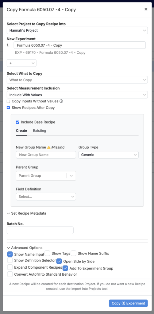 • Recipe Metadata – Fill in fields configured in Form Admin (e.g., batch number).