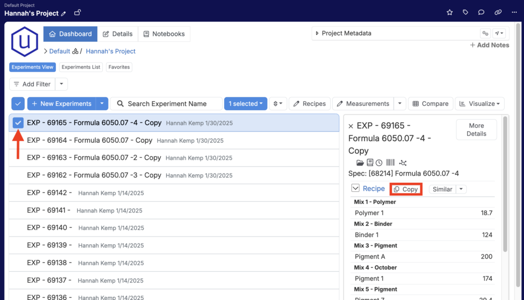 • From the Project Dashboard, open the details sidepanel for an experiment and click Copy.