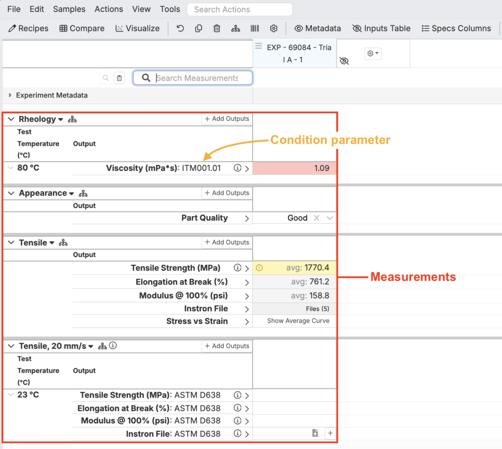 To access the Measurements view of experiments, click the Measurements button in the top-left corner of the toolbar. Here, users can record outputs, such as measurements and condition parameters, during and after experiments have been run.