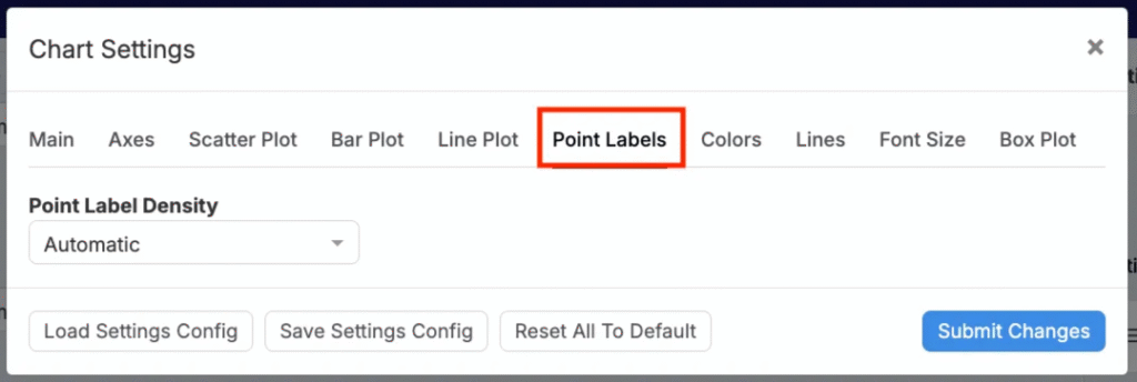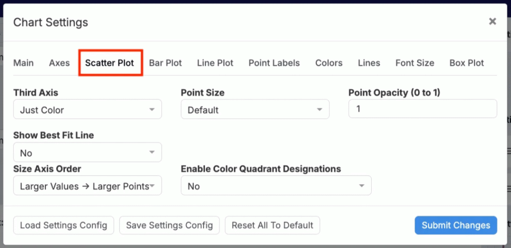 On the Explore Data page, clicking Settings opens a modal within which users can configure settings for the current visualization. Settings can be used to fine-tune axes, scales, legends, aggregation/binning, error bars, jitter/smoothing, and styling per plot.