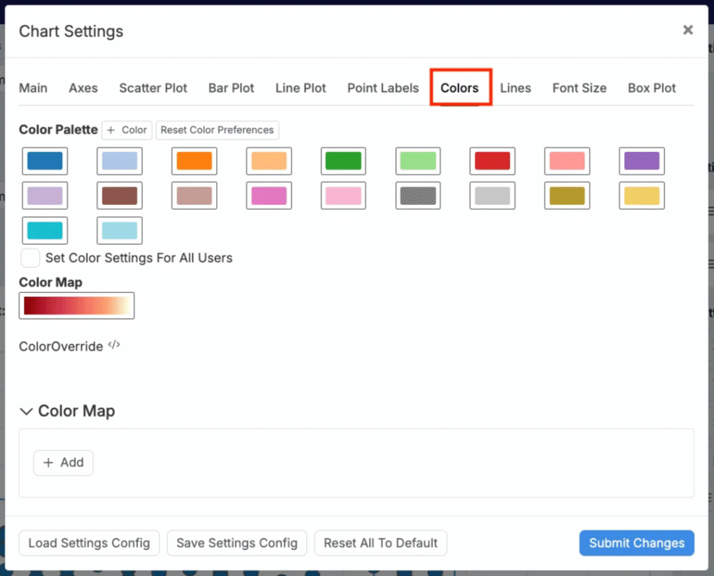 Use the Colors tab to adjust color mapping. Choose from 20 presets or upload a custom Color Map.