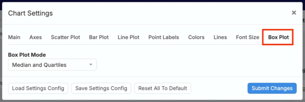 Use the Box Plot tab to choose a box plot display mode: Median & Quartiles or Mean & Standard Deviations.