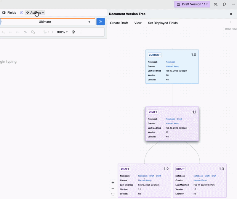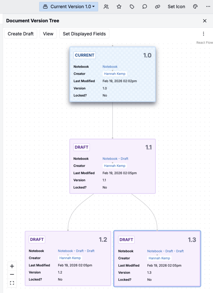 We’ve introduced document versions for notebooks, giving you a document version tree sidepanel with a flowchart view of how versions and drafts relate. This makes it easier to iterate on notebooks and it supports review-heavy workflows where teams need a clear audit trail of changes made over time.