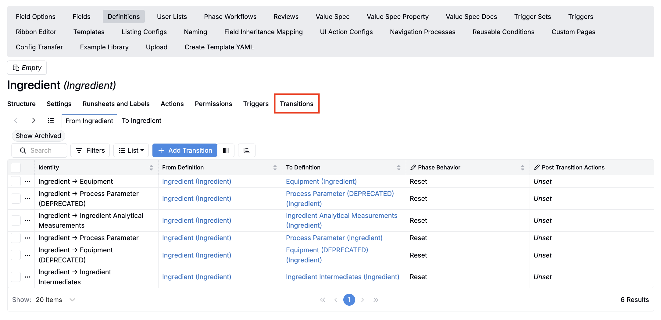 2. Navigate to the “From” definition (e.g. Ingredient) in Form Admin and open the Transitions tab.