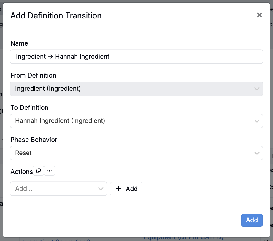 Previously, definition changing was limited to experiments and ingredients. With this update, any entity type with multiple definitions can support transitions if configured in Form Admin.