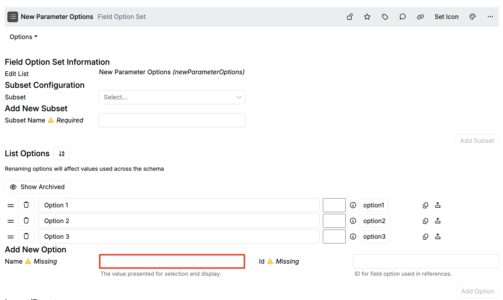 • On the Options Set page, under List Options, add all necessary parameter options. Learn more.