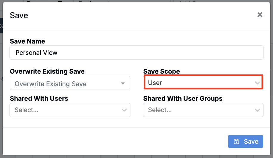 The Save Scope dropdown is only visible to users with the appropriate permissions, preventing confusion for users who cannot publish defaults.