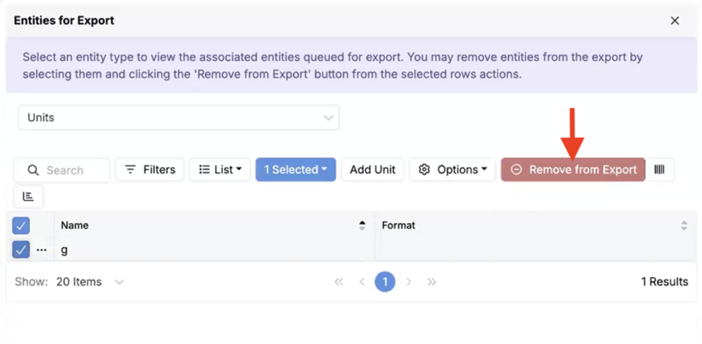 To remove an entity, select it from the listing and click Remove from Export.
