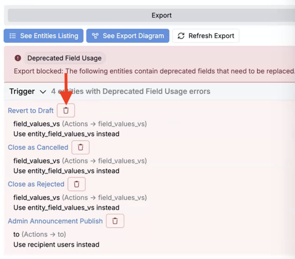You can also remove entities directly from the export page by clicking the red trash icon. Removing an entity creates an unbound reference, which can then be removed on import.