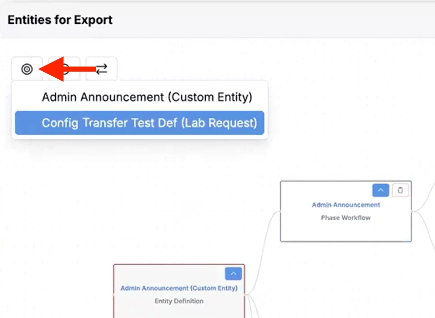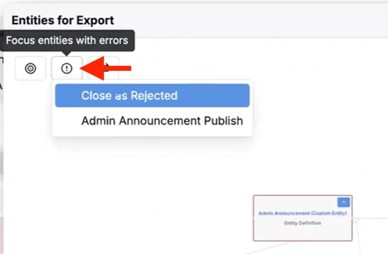 • Entities Listing — While reviewing an export, you can now click See Entities Listing to see everything that will be included. Use the field to select from different entity types. On the entities listing, review all entities of that type that will be exported.