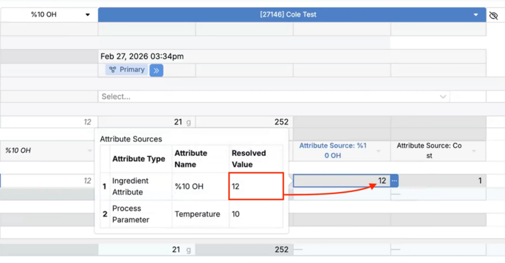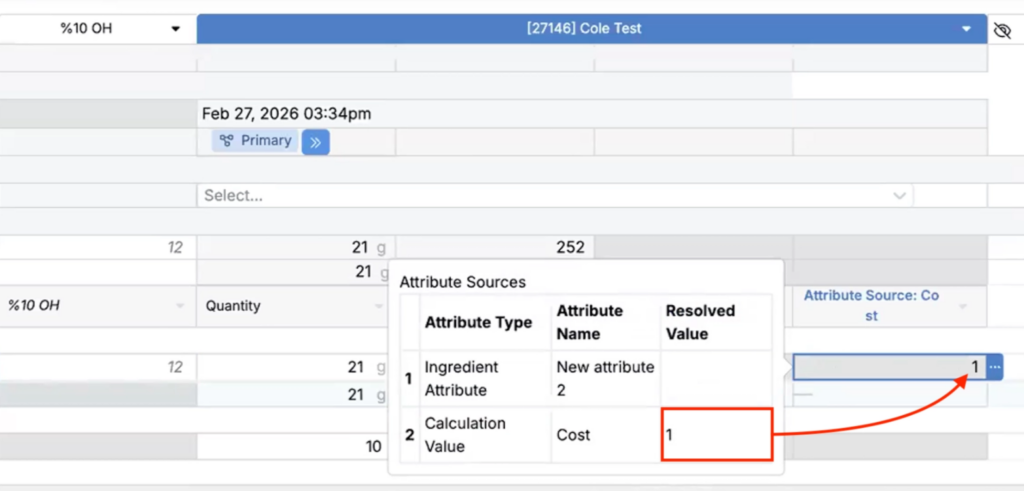 Many input calculations resolve values by trying a prioritized list of sources for each recipe ingredient cell. For example, a calculation might try an ingredient attribute first, then fall back to a lot output, then fall back again to a recipe input attribute. Previously, that resolution was hidden within the Edit Calculation modal, which made it hard to audit and explain results at a glance.