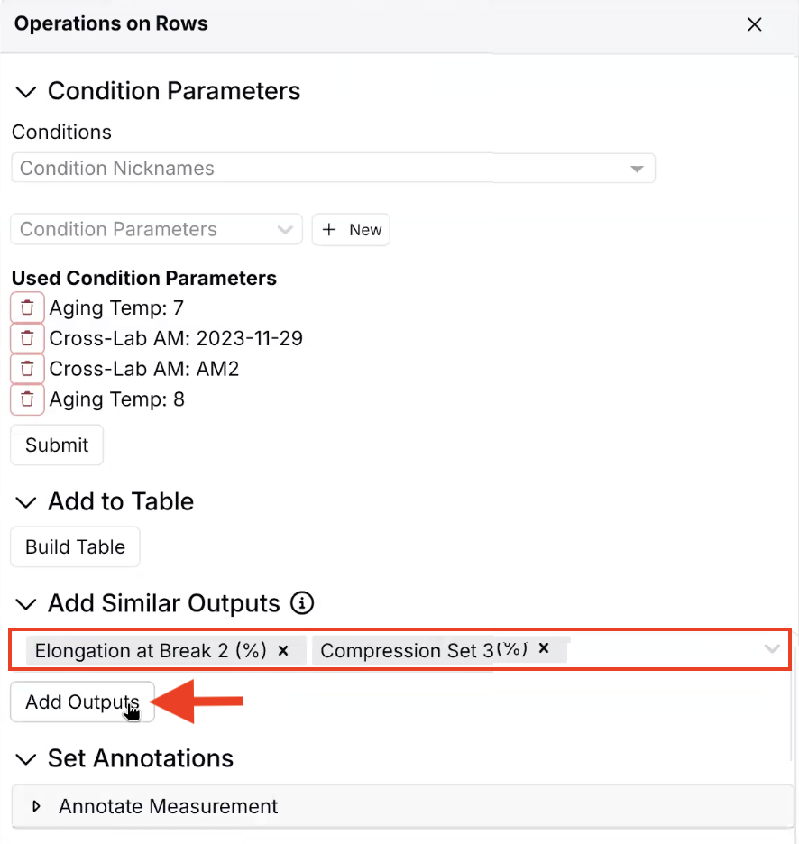 • Within the Operations on Row sidepanel, use the Add Similar Outputs section to select new outputs to add.