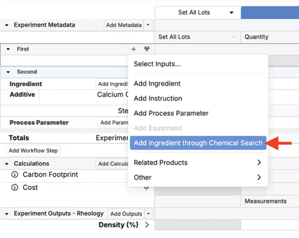 • On the Recipe view of an experiment, access the Add ingredient dropdown.