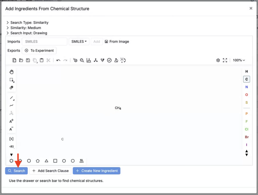 We’ve added an Add ingredient through Chemical Search option to the Add ingredient dropdown on the Recipe view of experiments. This new tool allows chemists can draw a chemical structure to find an existing ingredient or create a new one when they do not know the ingredient name.