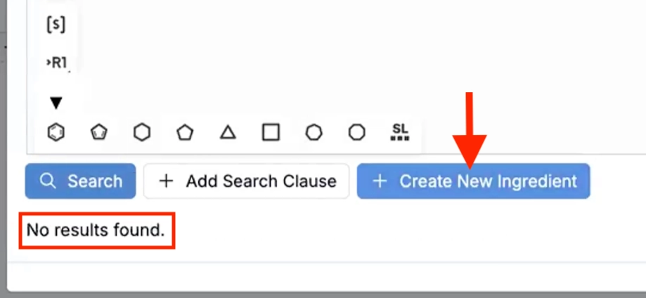 • If no matches are found, you will see a “No results found” message. You can then click Create New Ingredient to open the create ingredient modal, with fields auto-filled based on the drawn chemical structure.
