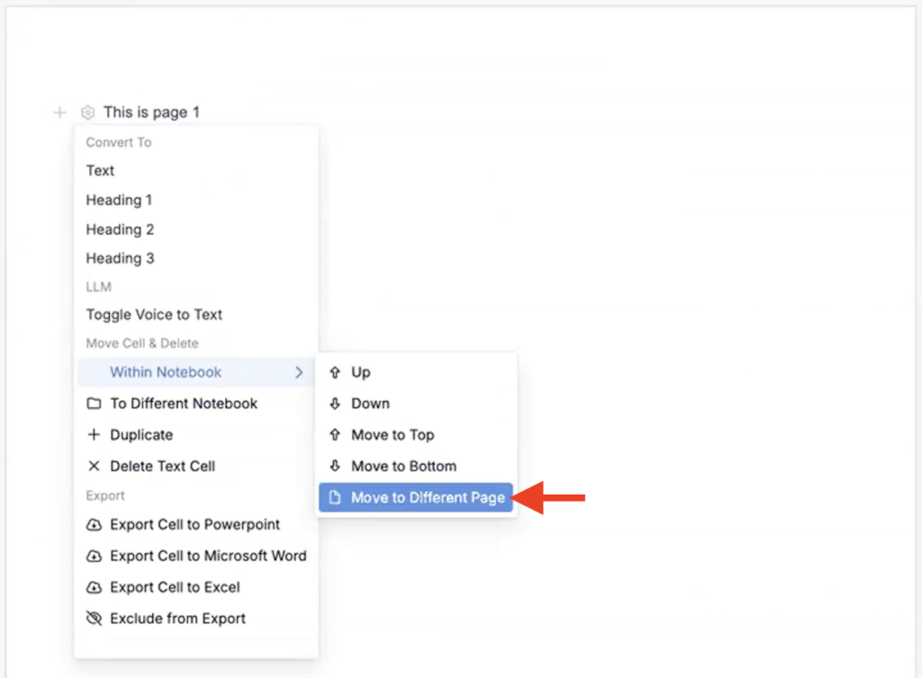 To do so, click any notebook cell’s ⚙️ icon to access its cell menu. Within the menu, select Within Notebook > Move to Different Page. Then select a notebook page to move to.
