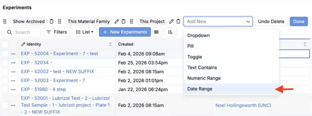 • Pagination — The sidepanel now supports pagination at both the experiment and workflow level, so you can move through longer experiments without excessive scrolling. Use the left and right experiment arrows to navigate between experiments in view. Use the left and right workflow step arrows to navigate between experiment workflow steps.