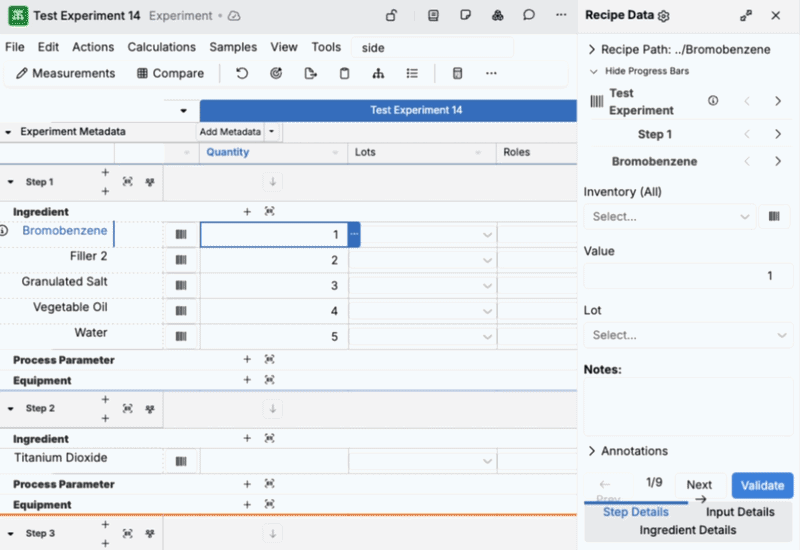 • Add ingredient by inventory barcode — When you enter or scan an inventory barcode in the sidepanel, you can now automatically add that item as a new ingredient. To do so, select a workflows step and confirm. After adding it, the sidepanel automatically navigates you to the newly added ingredient.