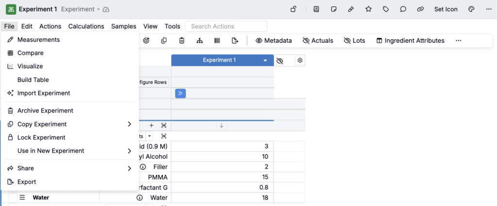 The File Menu on the Recipe view of experiments provides centralized access to all actions, tools, and settings available when working with recipe data. This menu organizes functionality into menus, making it easier to find and use the features you need.