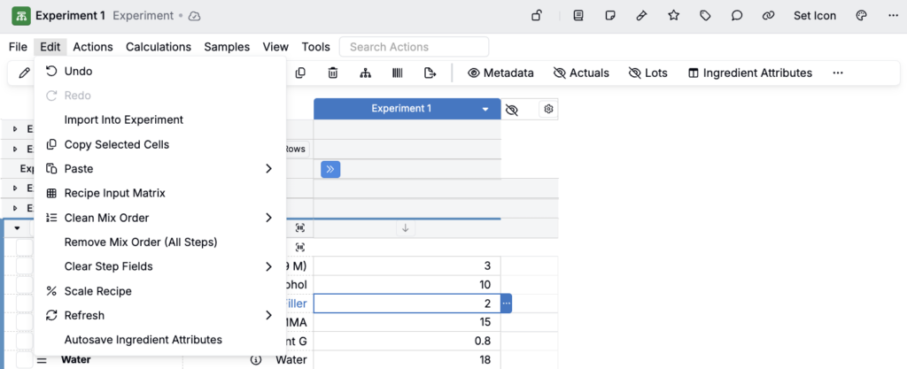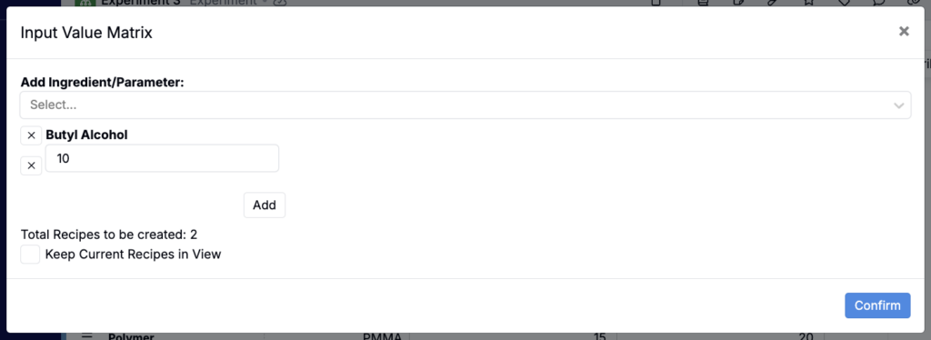 - Recipe Input Matrix — Allows you to generate multiple new experiments by adding an ingredient/parameter to the active experiment.
