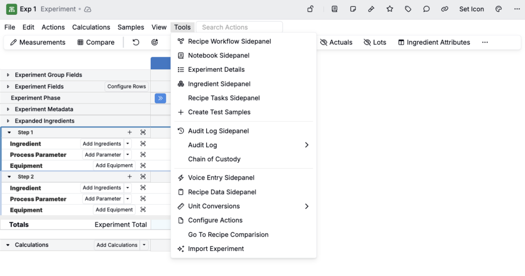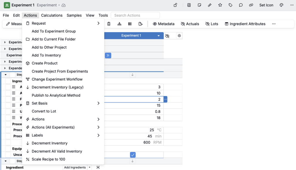 - Recipe Data Sidepanel — Opens a mobile-optimized sidepanel for viewing recipe information and navigating between experiments, workflow steps, and ingredients. Supports barcode scanning, voice entry, and editing recipe columns including expected values, actuals, lots, inventory items, and calculations.
