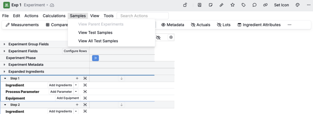 - Related Recipes Sidepanel — Opens a sidepanel that allows you to quickly view and navigate the other recipes tied to what you are working on (e.g. a parent experiment and its test samples), and helps you compare across them without hunting for links.