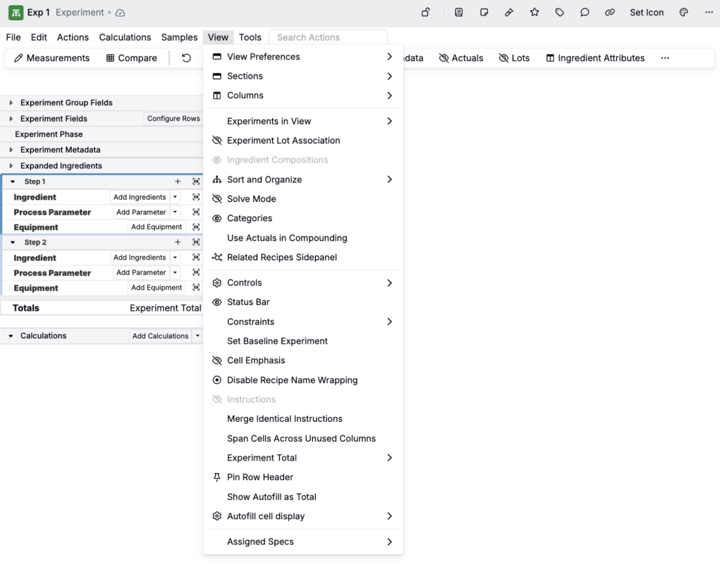 - Sections — Show or hide sections (Experiment information, Mix Instructions, Process Parameters, Equipment, etc.)