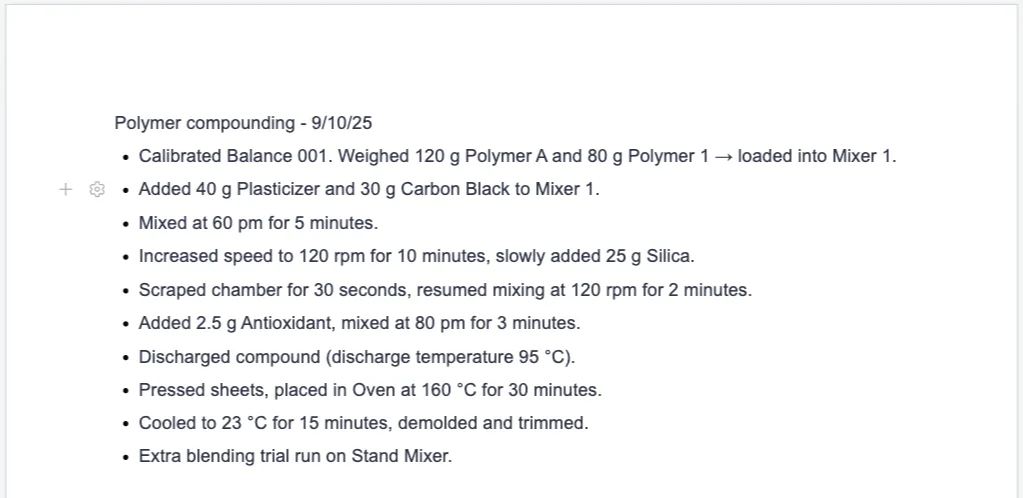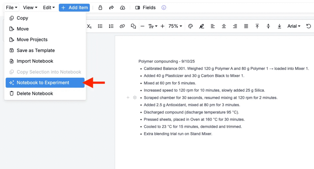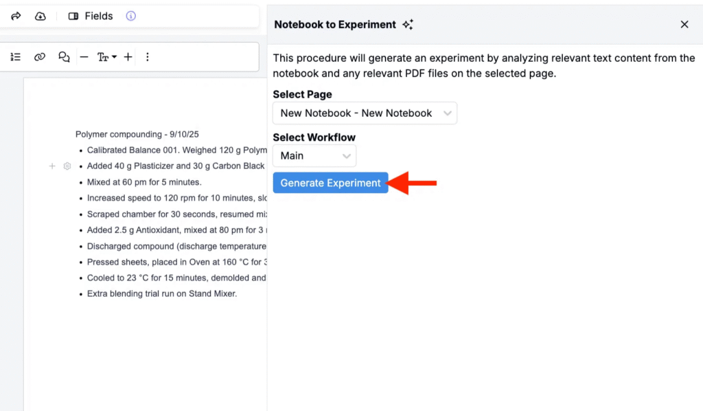 Uncountable users with Gen AI enabled can use the Generate Experiments from Instructions tool to transform text in notebooks into a structured experiment. Simply describe the procedure and the assistant extracts ingredients, process parameters, and equipment in order, then creates a recipe tied to your workflow.