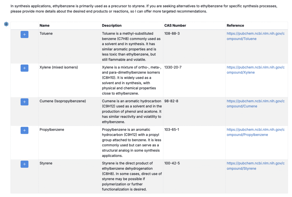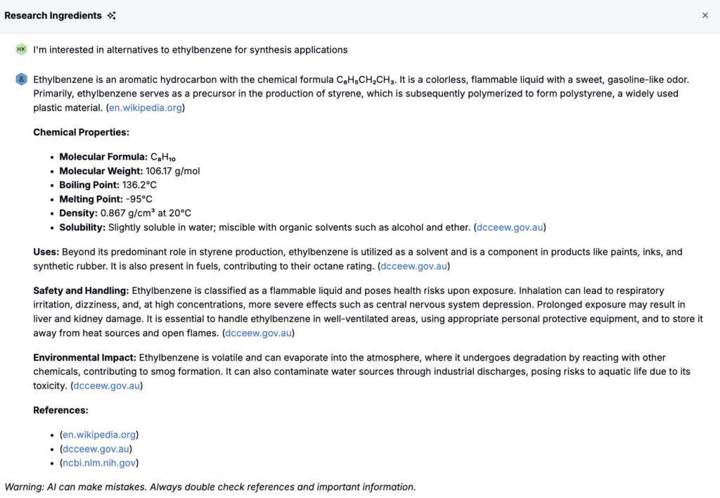 Tip: Start broad, then narrow. Begin with a general prompt, then add constraints for hazard class, feedstock, availability, or supplier.
