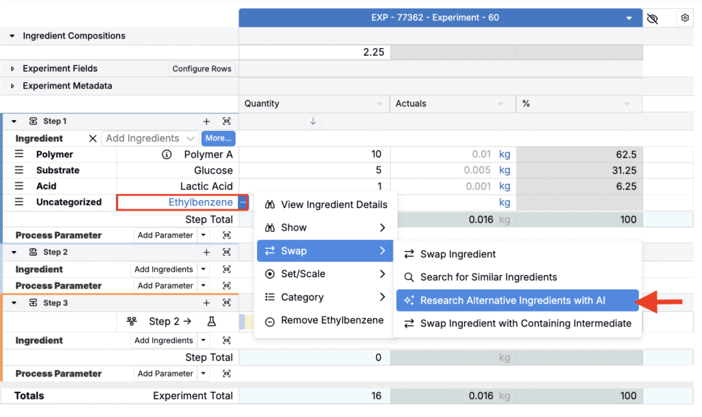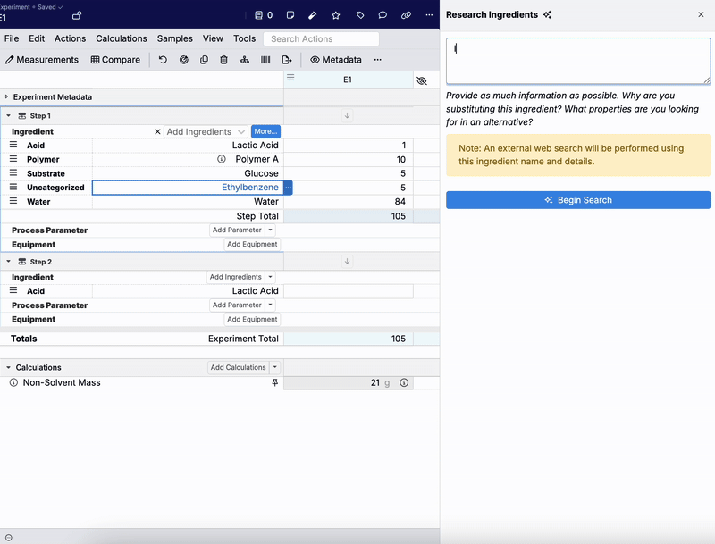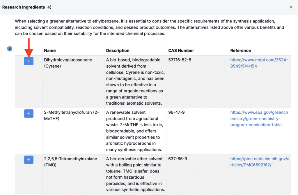 | Research Alternative Ingredients | AI-powered tool that searches external sources based on a prompt. Returns structured alternatives with supporting data and links. | Exploratory research or early-stage projects without predefined options. | |