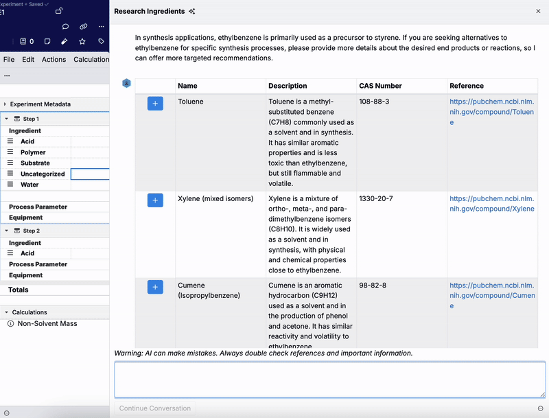 The Research Alternative Ingredients is an LLM tool helps you discover potential substitutes sourced from public chemical databases and the open web, and then bring these substitutes into your Uncountable workspace.