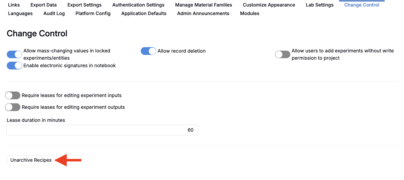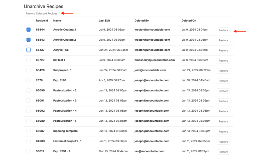 Unarchiving a recipe in the Uncountable platform restores previously archived recipes, making them available for use again. This functionality is only available for Global Admins and can be accessed through Company-Wide Settings.