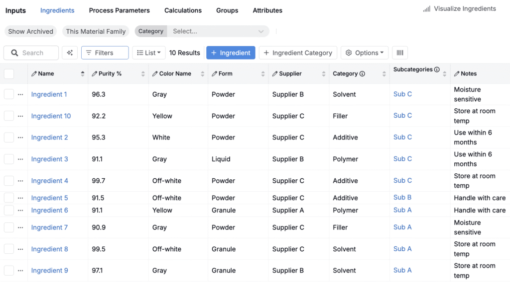 The Ingredient Importer allows you to quickly bulk import new ingredients into the platform. On import, you can include ingredient attributes, categories, subcategories, and lot information.