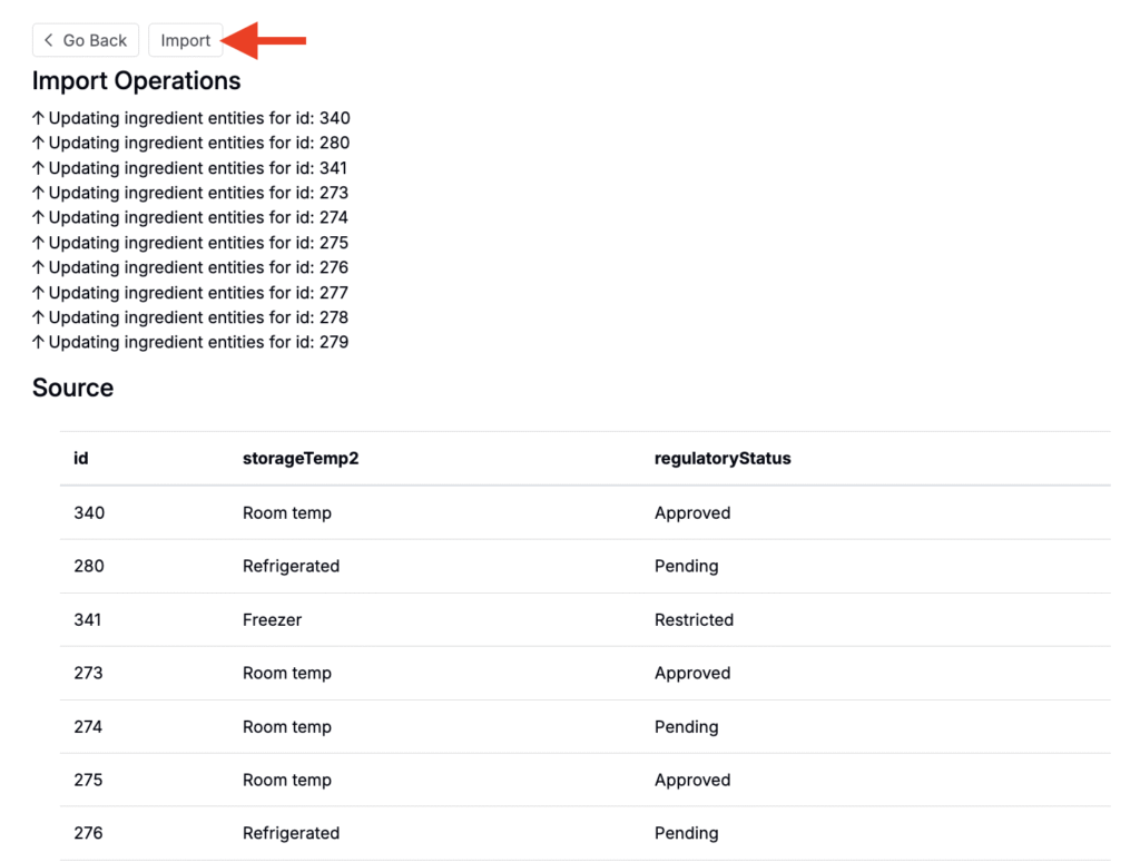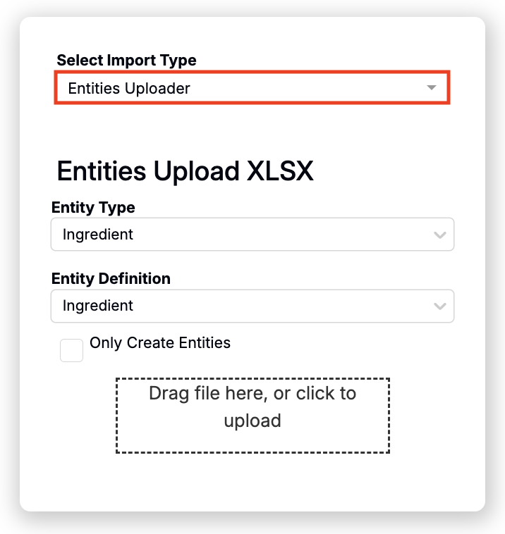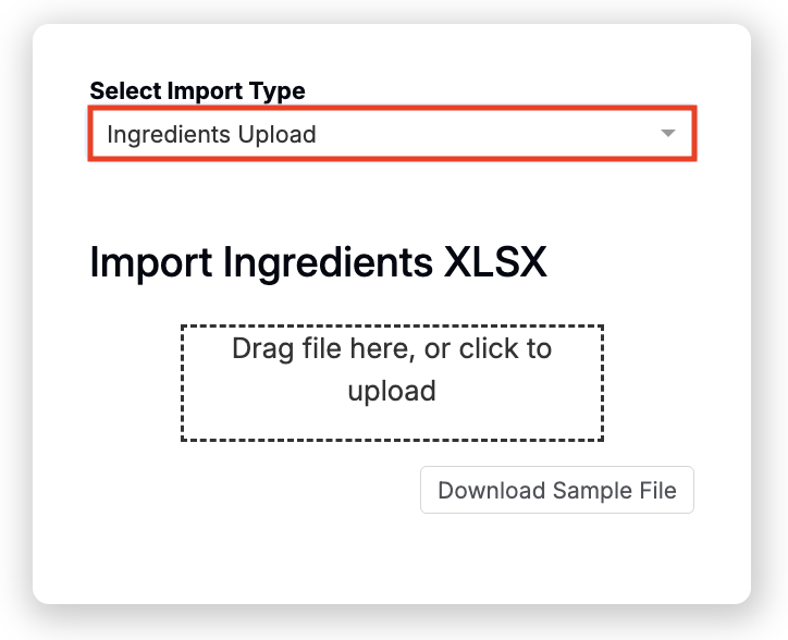 - Import your ingredients — Navigate to the Importer page, select the Ingredients Upload Import Type, drag in your prepared spreadsheet, review, and import.