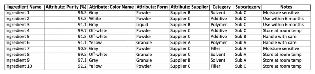- Prepare your ingredient list — Create a spreadsheet with the columns for ingredient name, attributes, category, subcategory, etc.